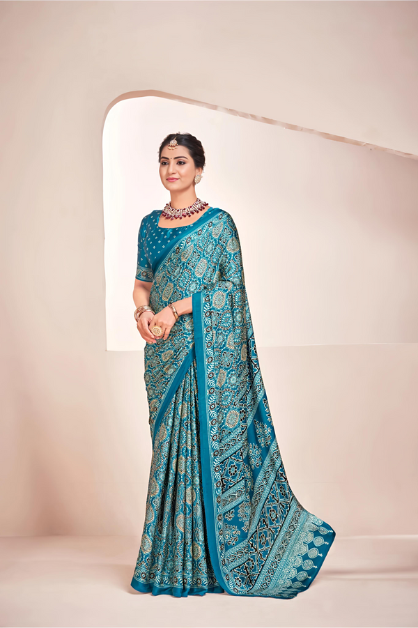 Ajrakh Printed Modal Silk Saree With Ajrakh Blouse