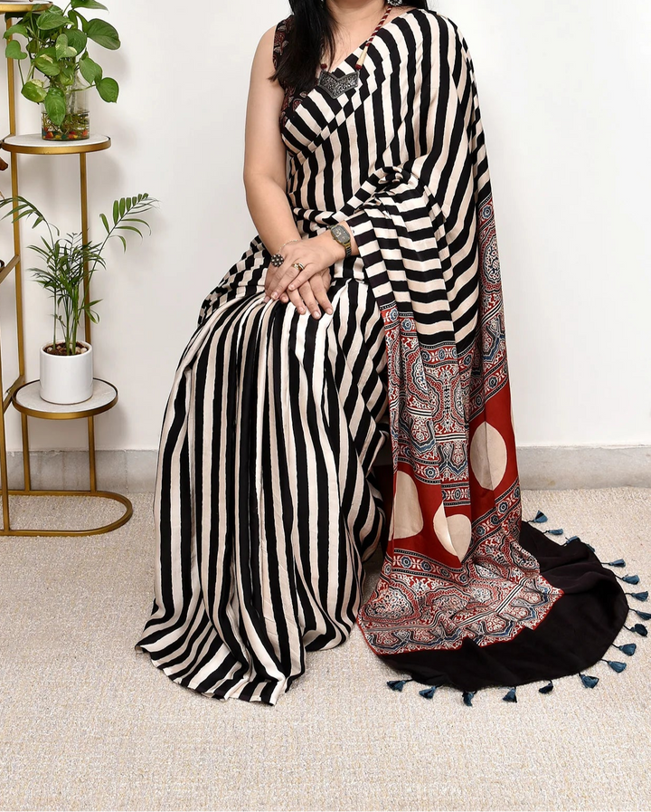Saree work : Digital Print Border with Ajrakh Rich Pallu With Contrast Blouse