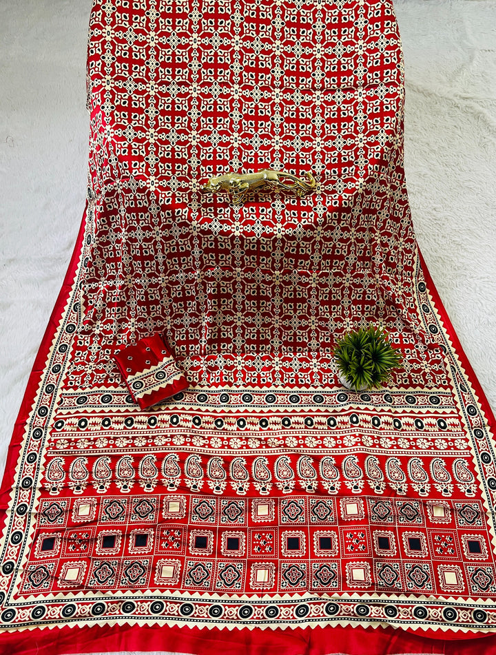 Red Ajrakh Primum Modal Silk Saree With Blouse
