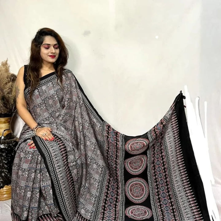 Saree work : Digital Print Border with Ajrakh Rich Pallu With Contrast Blouse