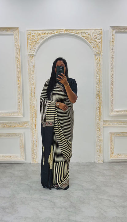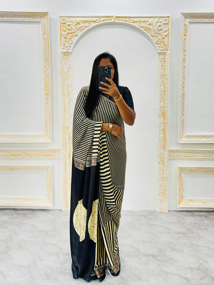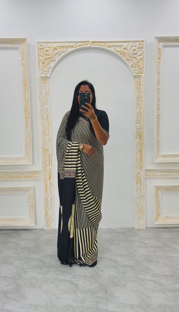 Saree work : Digital Print Border with Ajrakh Rich Pallu With Contrast Blouse
