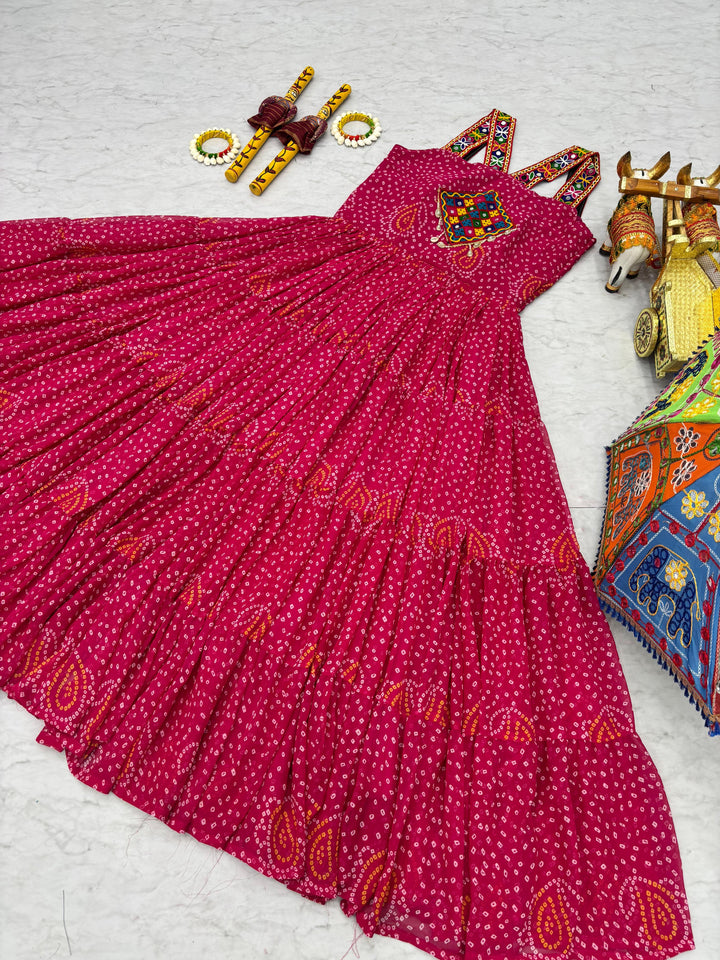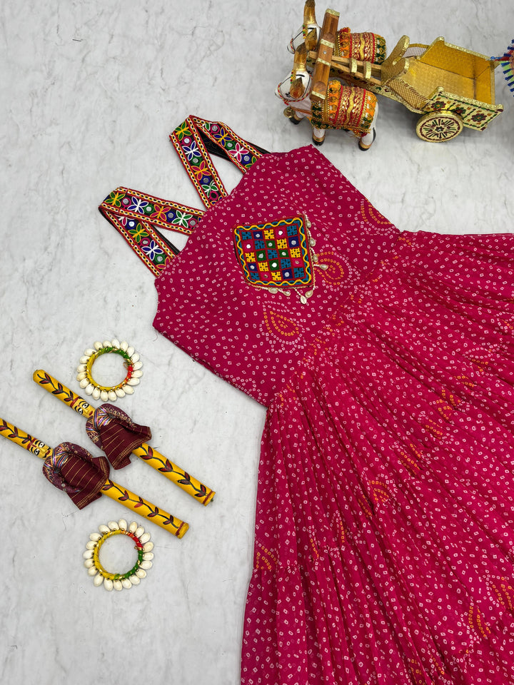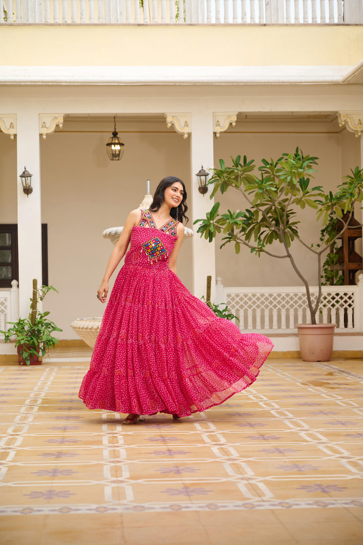 3 Pink Bandhani Mirror Work Gown Fully Stitched Festive Outfit for Ras Garba Nights