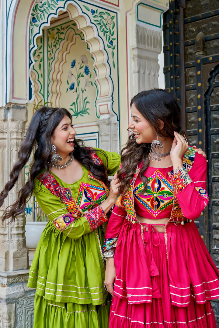 Parrot Color Gamthi Mirror Work Navratri Lehenga Set Cotton Perfect for Garba Nights