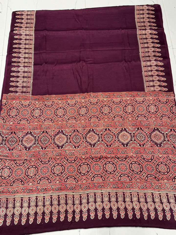 Wine Ajrakh Hand Block Modal Silk Saree With Fancy Ajrakh Pallu and Border