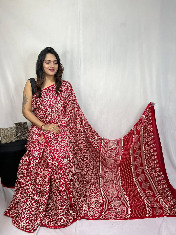 Red Ajrakh Primum Modal Silk Saree With Blouse