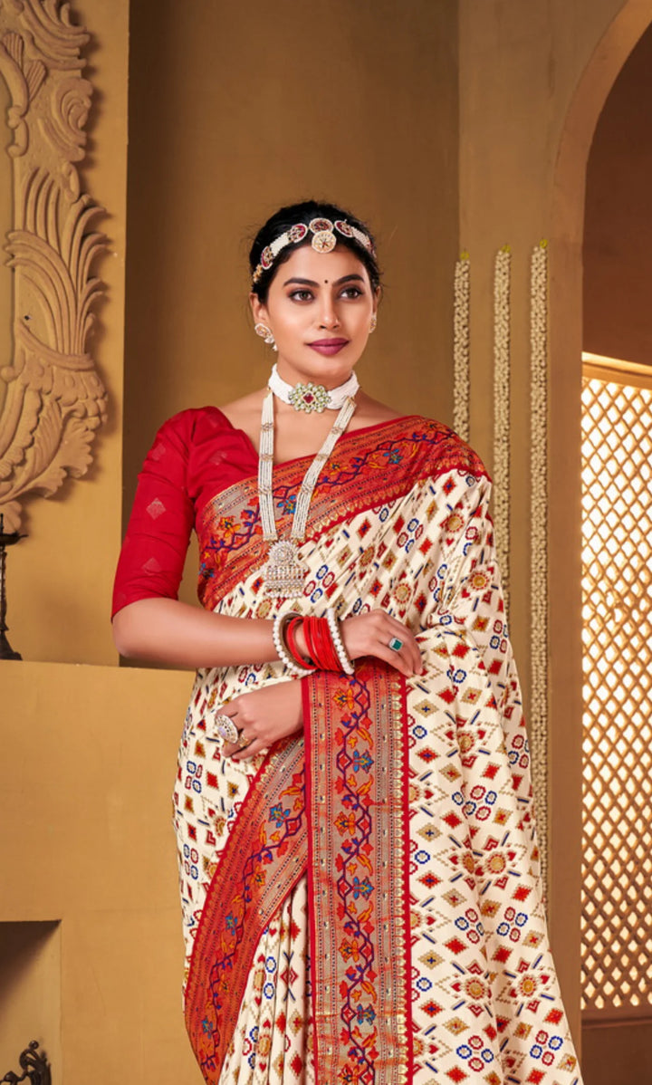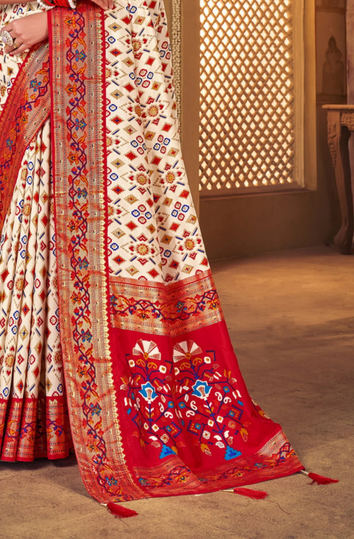 Professionally crafted with expert precision, the Butter White Soft Dola Silk Paithani Patola Saree boasts intricate allover foil Ikkath prints and a stunning ikkath foil print border in a bold, striking blue color.