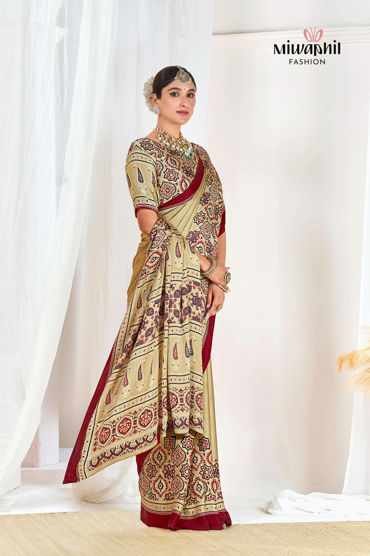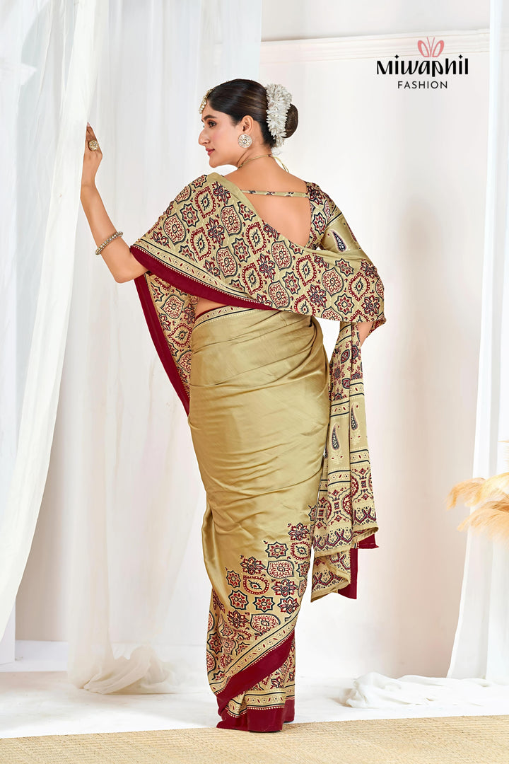 Cream Ajrakh Printed Modal Silk Plain Saree With Ajrakh Blouse P6