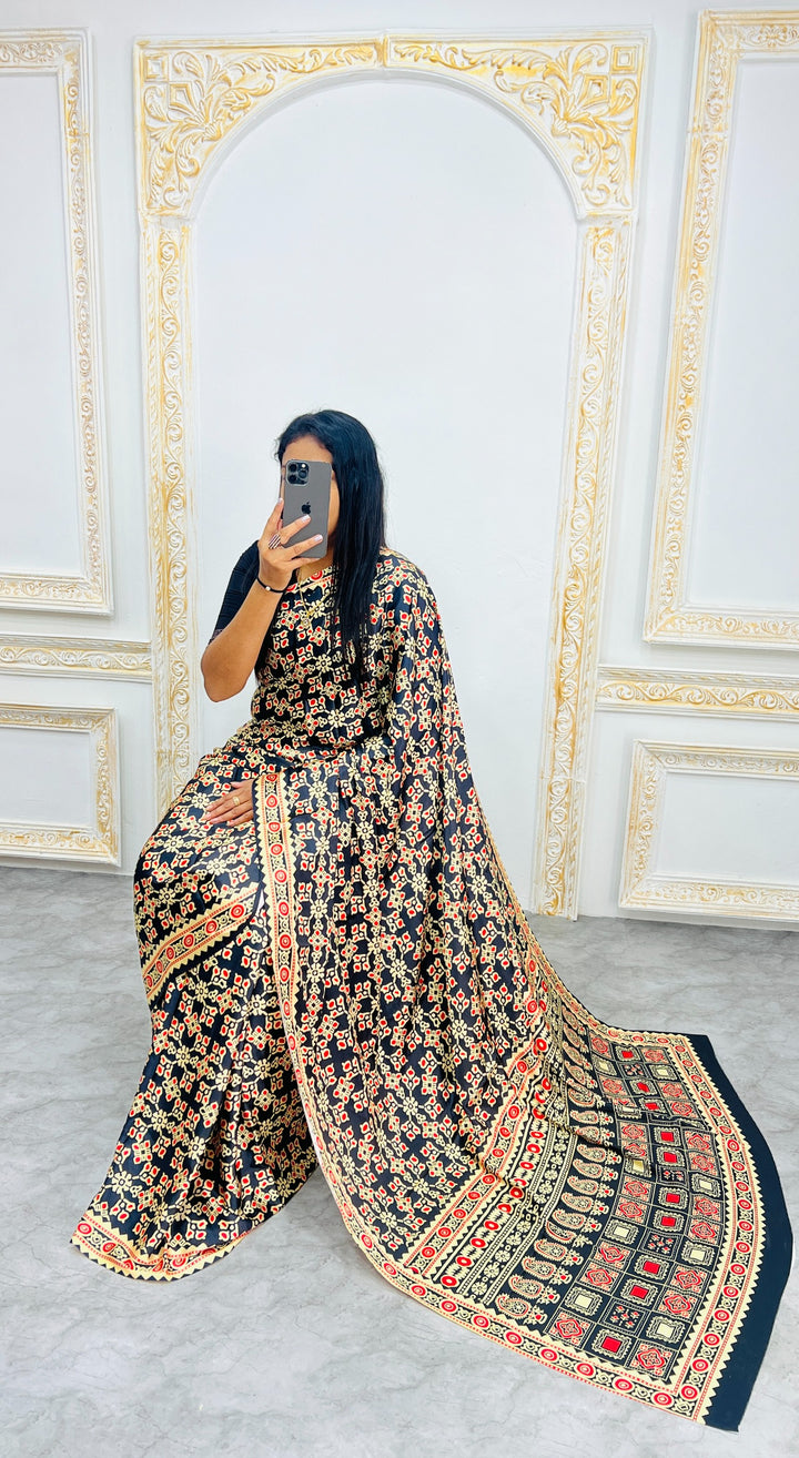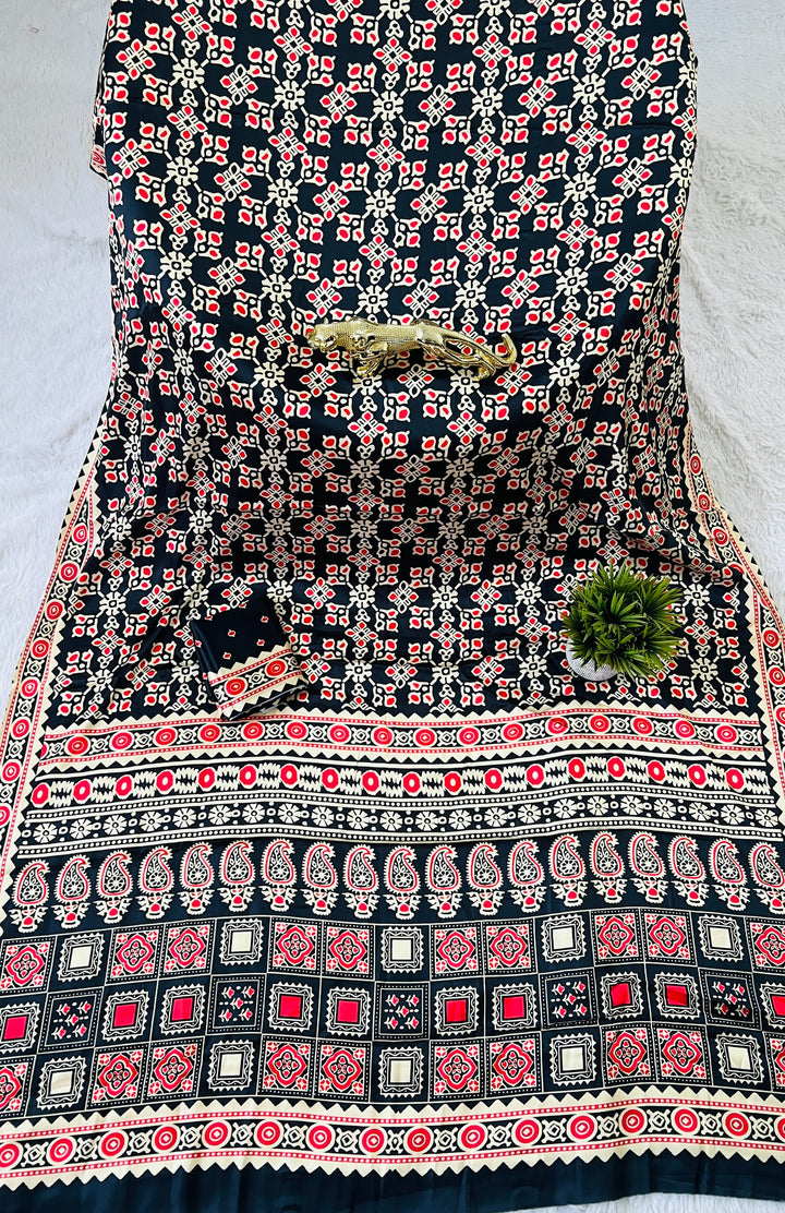 Available in semi gaji silk ajrakh natural digital print saree with ajrakh and fancy ajrakh pallu saree Same fabric Ajrakh blouse.