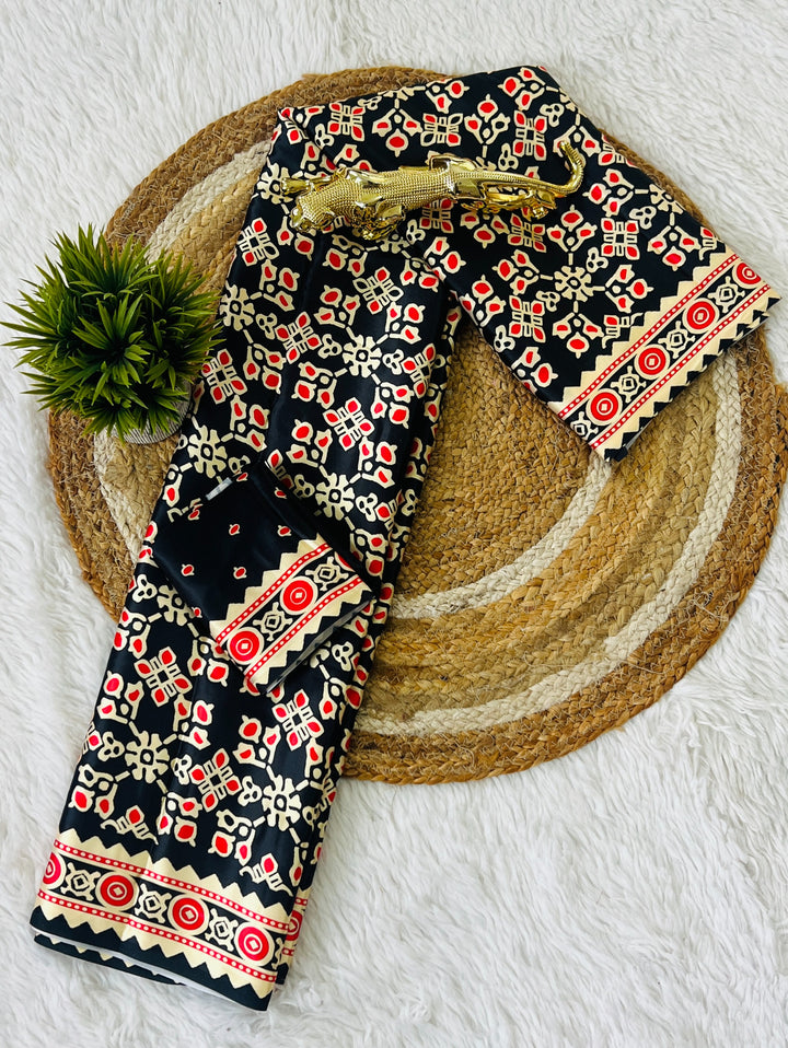 Saree work : Digital Print Border with Ajrakh Rich Pallu With Contrast Blouse