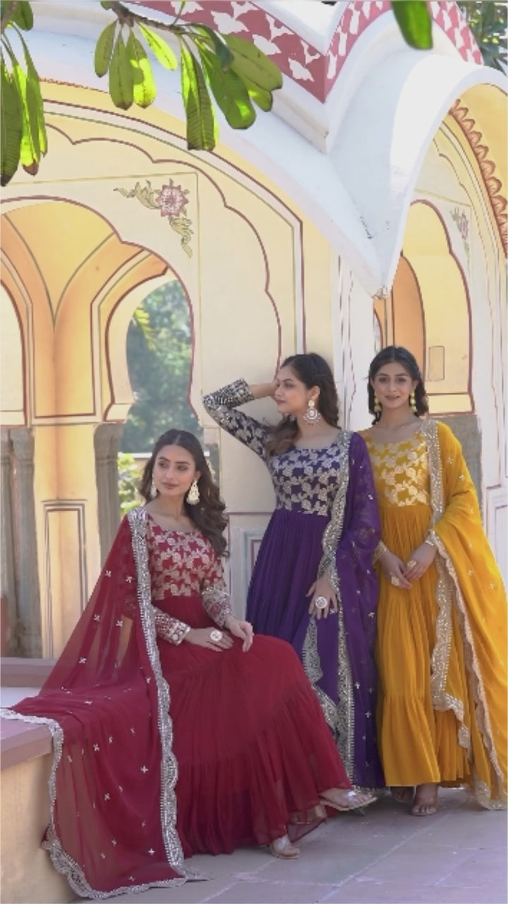 💗 Faux Blooming gown with Viscose Dyable Jacquard With Sequins Embroidered Work Faux Blooming Dupatta, it will enhance can combine the best parts of western and Indian wear into one stunning ensemble. 💝