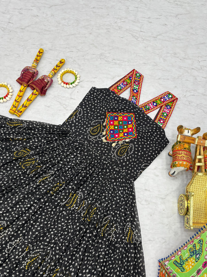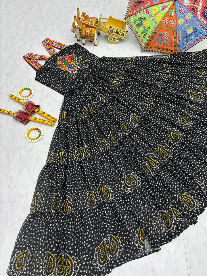 Black Bandhani Georgette Gown with Real Mirror Codi Lace Garba Night Statement Look