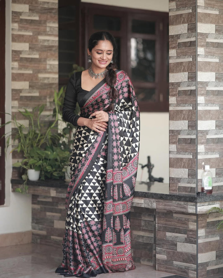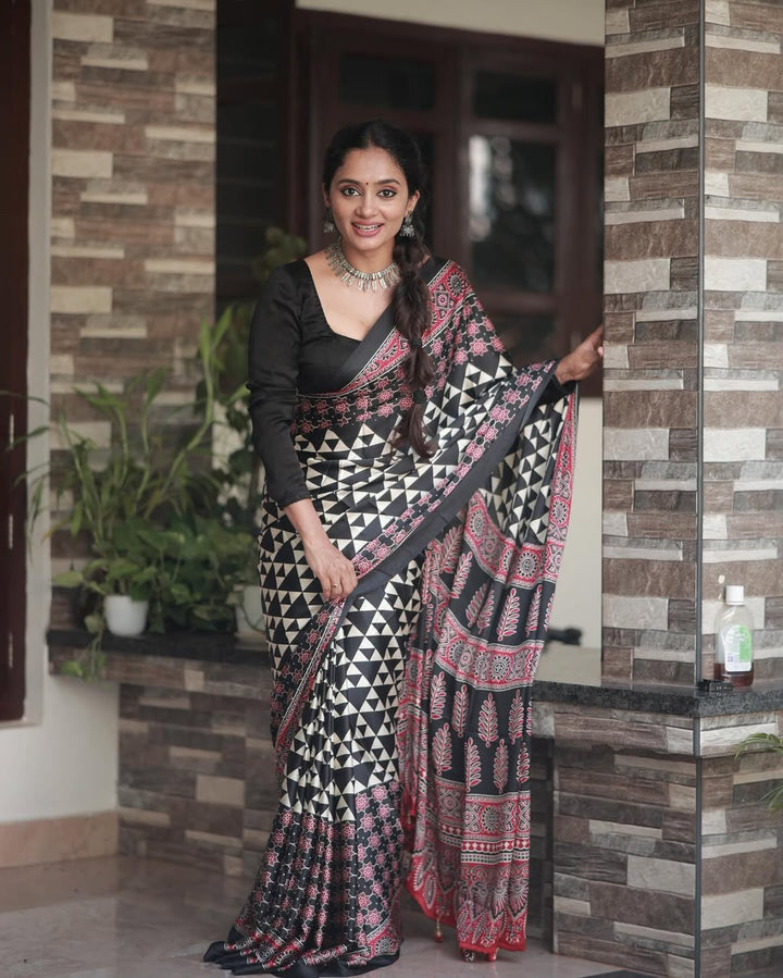 Maroon Black Ajrakh Primum Modal Silk Saree With Blouse