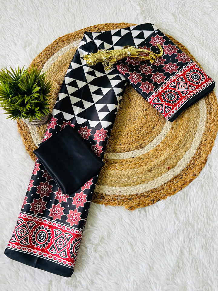 Saree work : Digital Print Border with Ajrakh Rich Pallu With Contrast Blouse