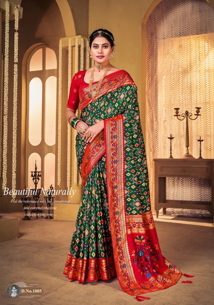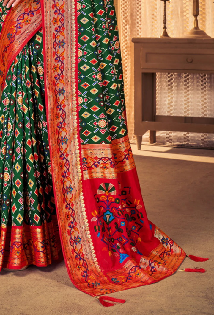 Professionally crafted with expert precision, the Green Soft Dola Silk Paithani Patola Saree boasts intricate allover foil Ikkath prints and a stunning ikkath foil print border in a bold, striking blue color.