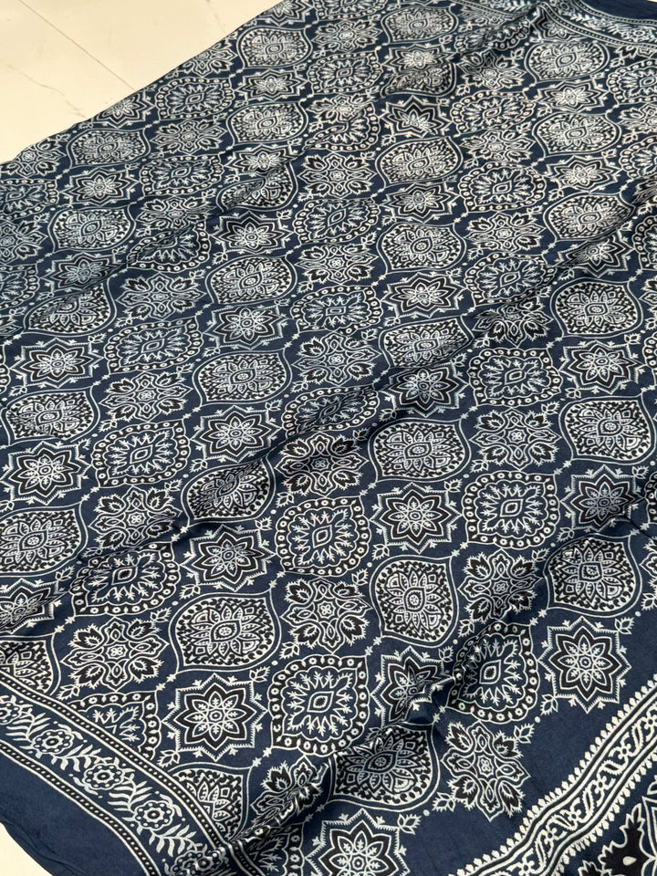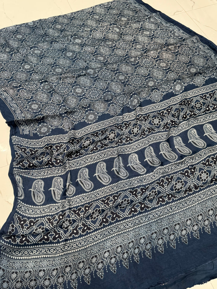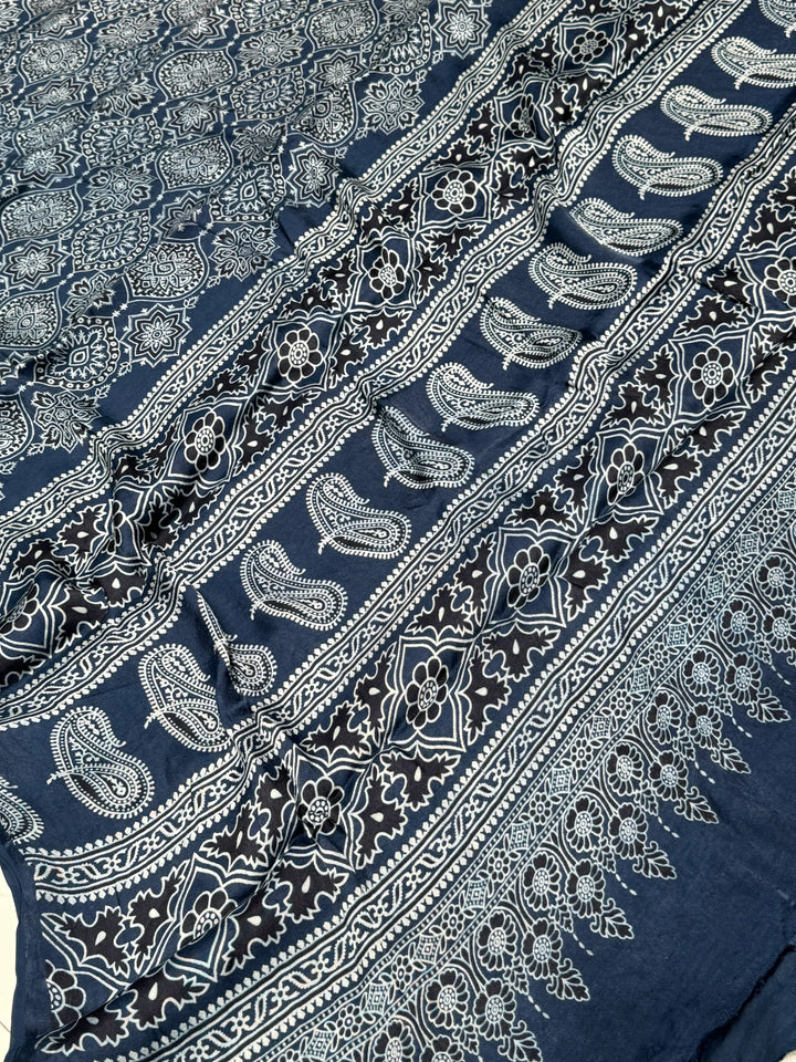 Indigo Blue Ajrakh Hand Block Modal Silk Saree With Fancy Ajrakh Pallu