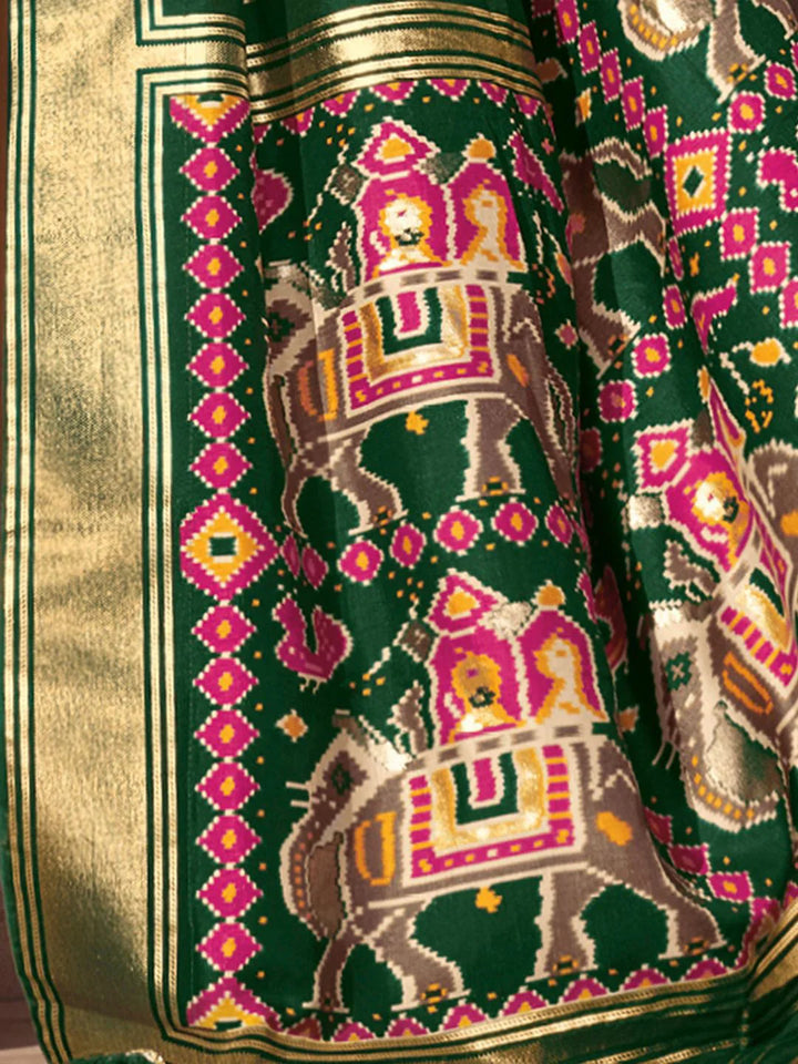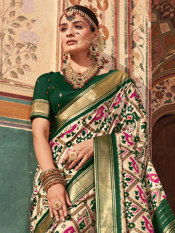Crafted from high-quality silk and featuring an elegant Patola print, this saree is accompanied by a matching Contrass pallu saree and blouse in the same fabric.