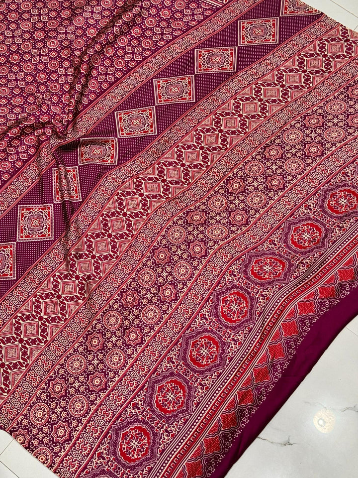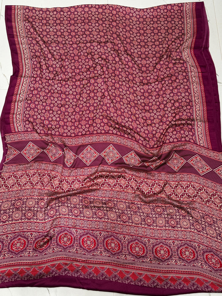 Wine Ajrakh Printed Soft Modal Silk Natural Print Saree P1