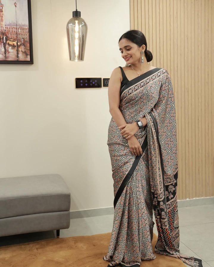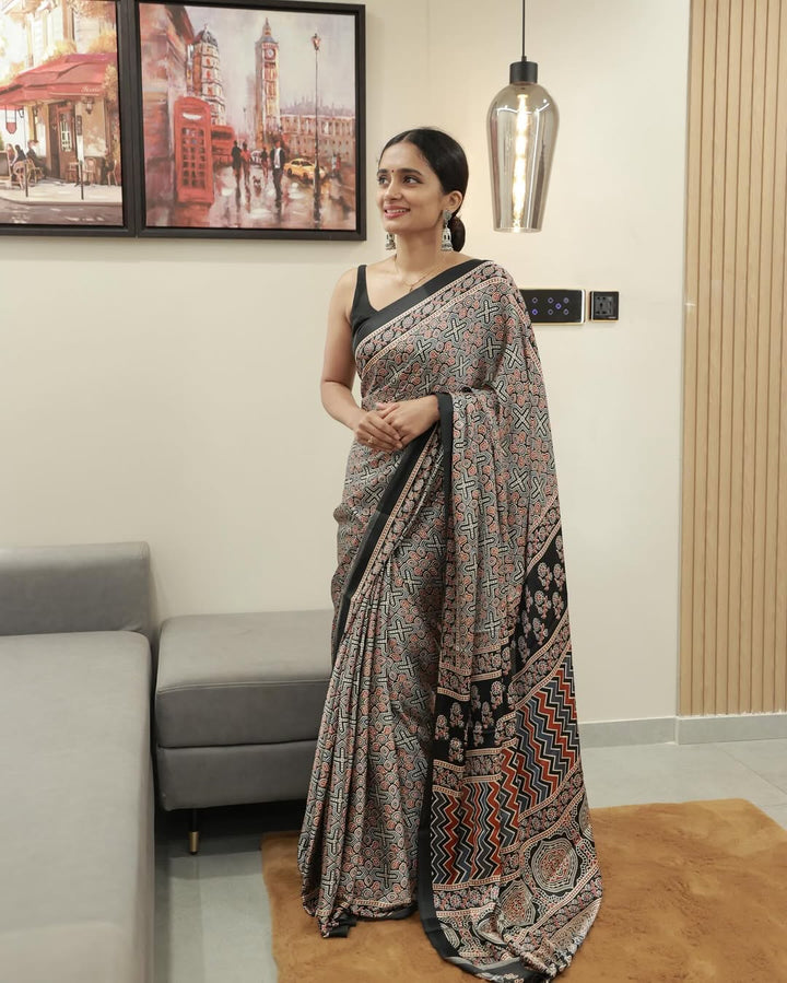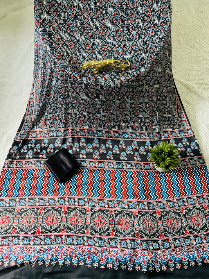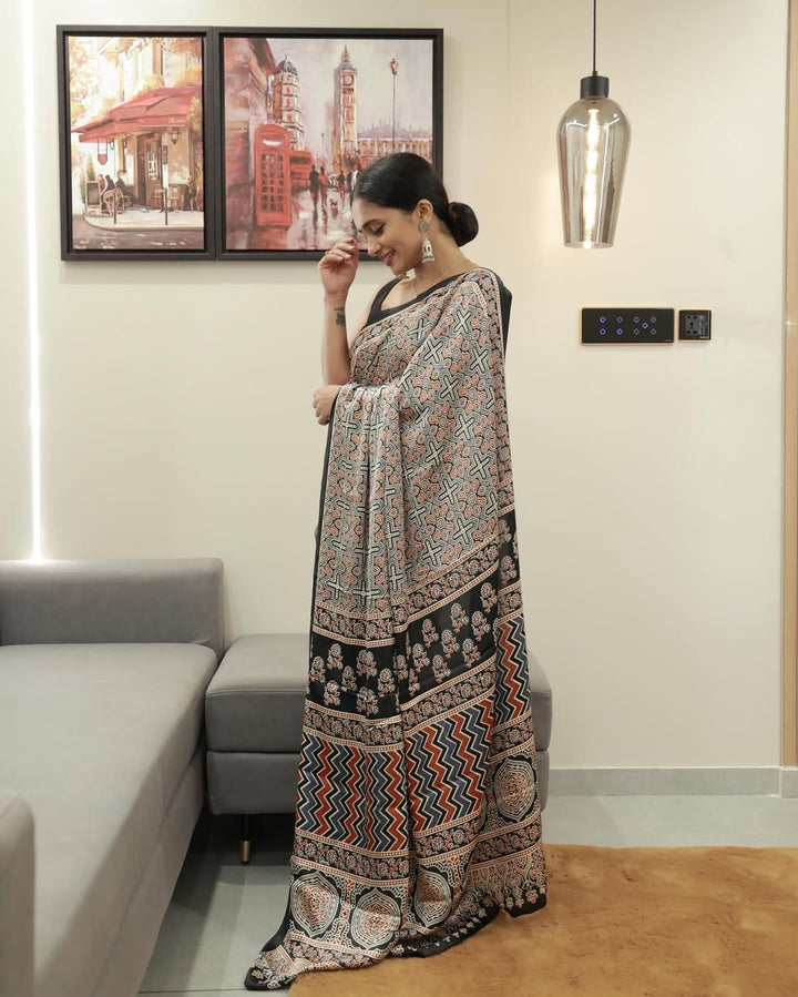 Black Line Ajrakh Primum Modal Silk Saree With Blouse