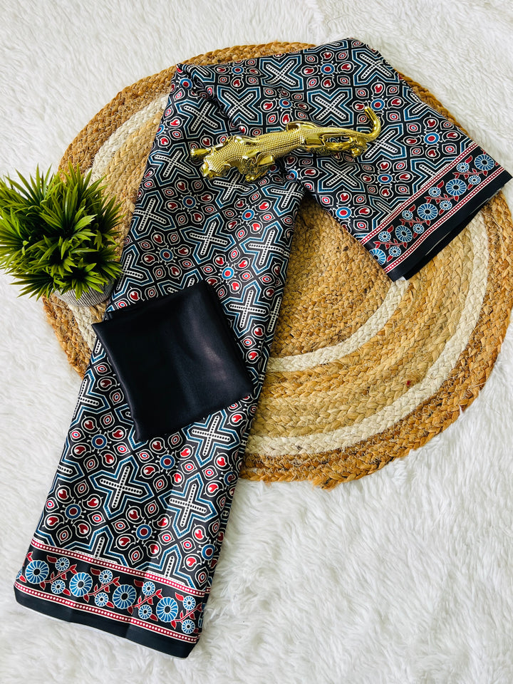 Available in semi gaji silk ajrakh natural digital print saree with ajrakh and fancy ajrakh pallu saree Same fabric Ajrakh blouse.