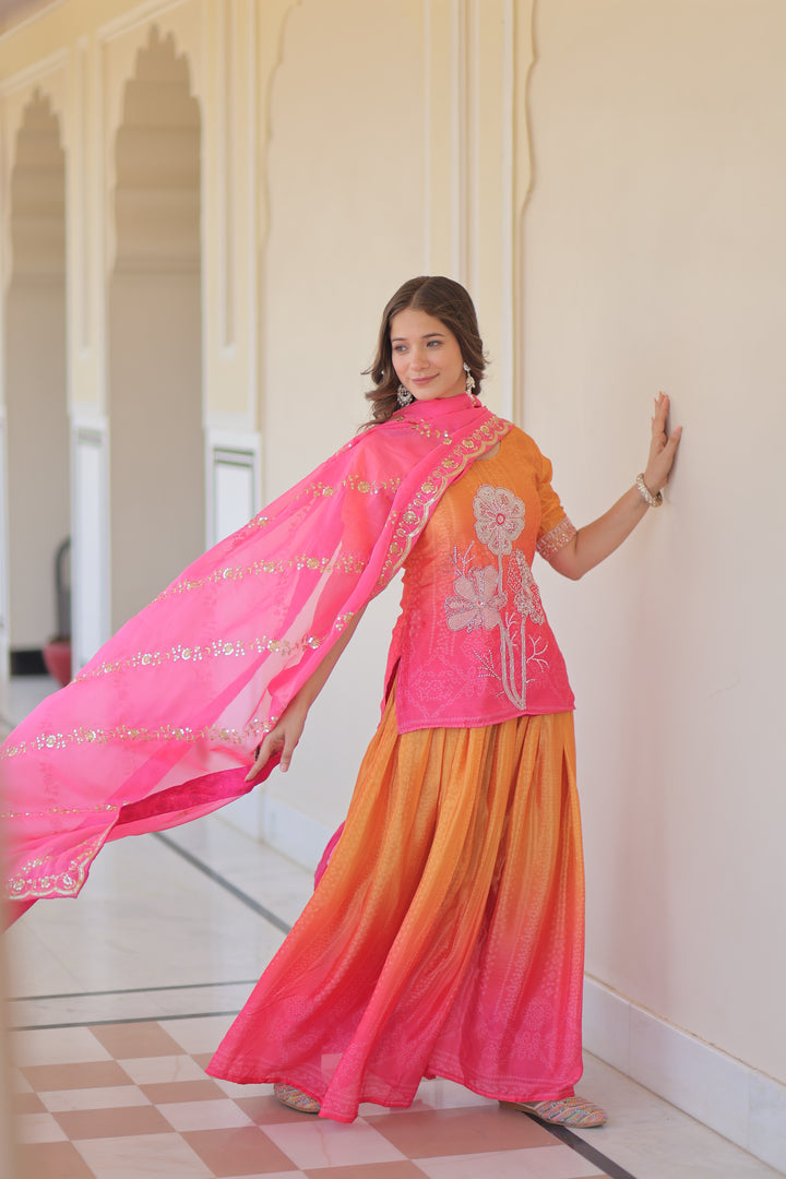 Pink Chinnon Print With Beads Embroidered Work Sharara Suit