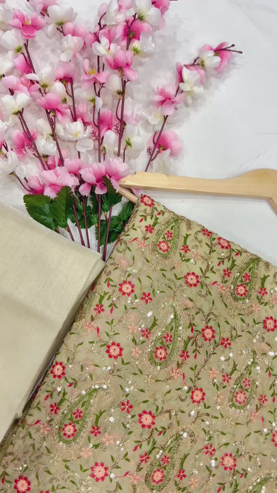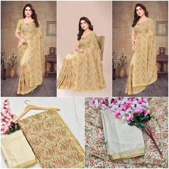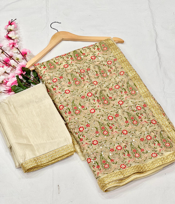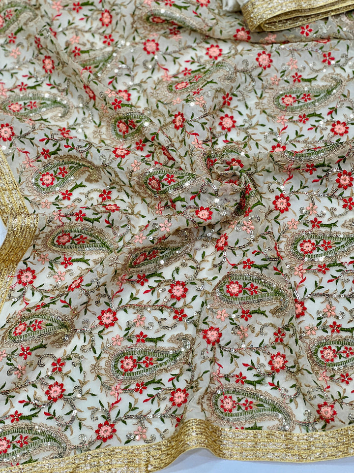 🏷️ Saree :- Heavy Fox Georgette With Multi + Zari Embroidery & 3.MM Sequence In Pallu_Skirt Work Saree And Readymade Embroidery Lace Work