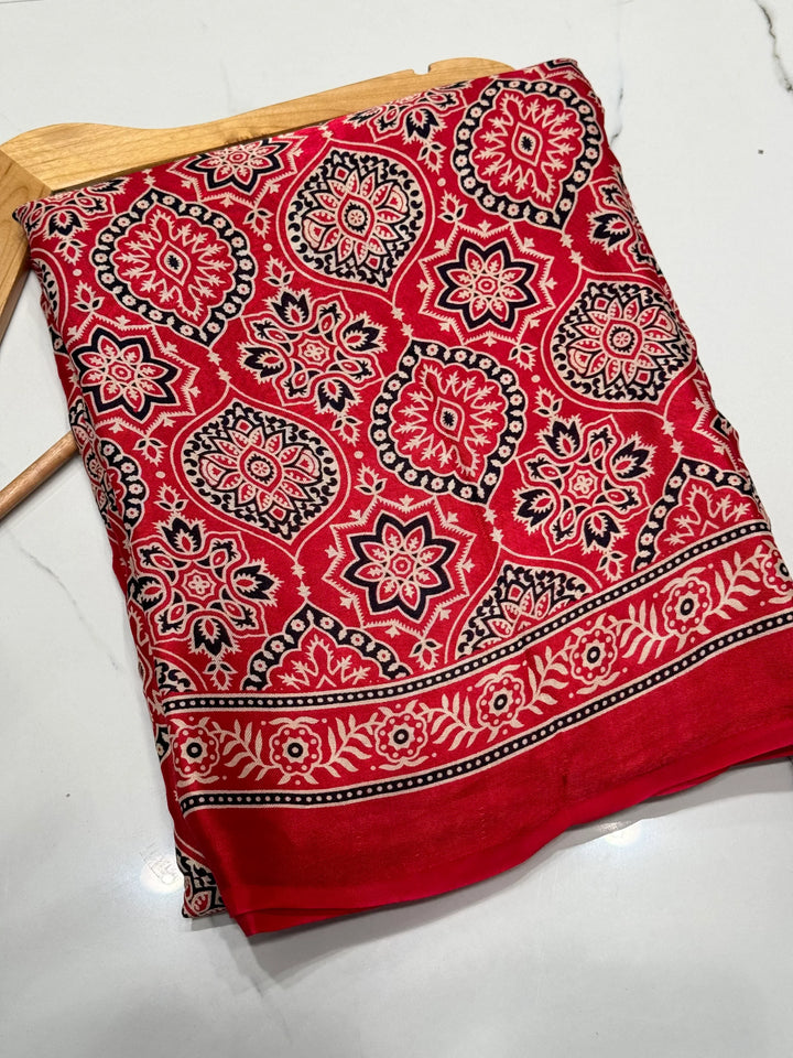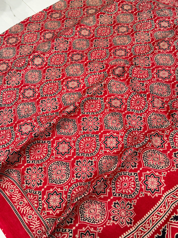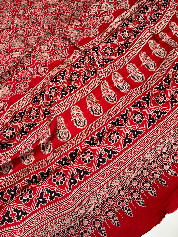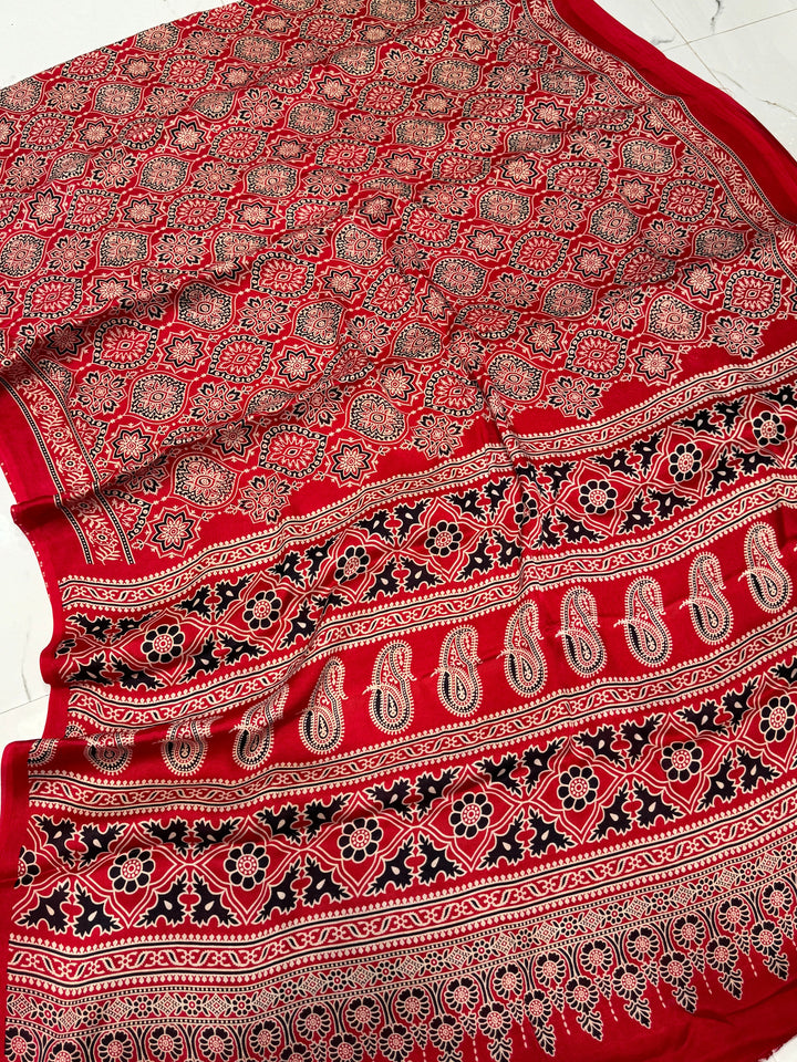 Red Ajrakh Hand Block Modal Silk Saree With Fancy Ajrakh Pallu