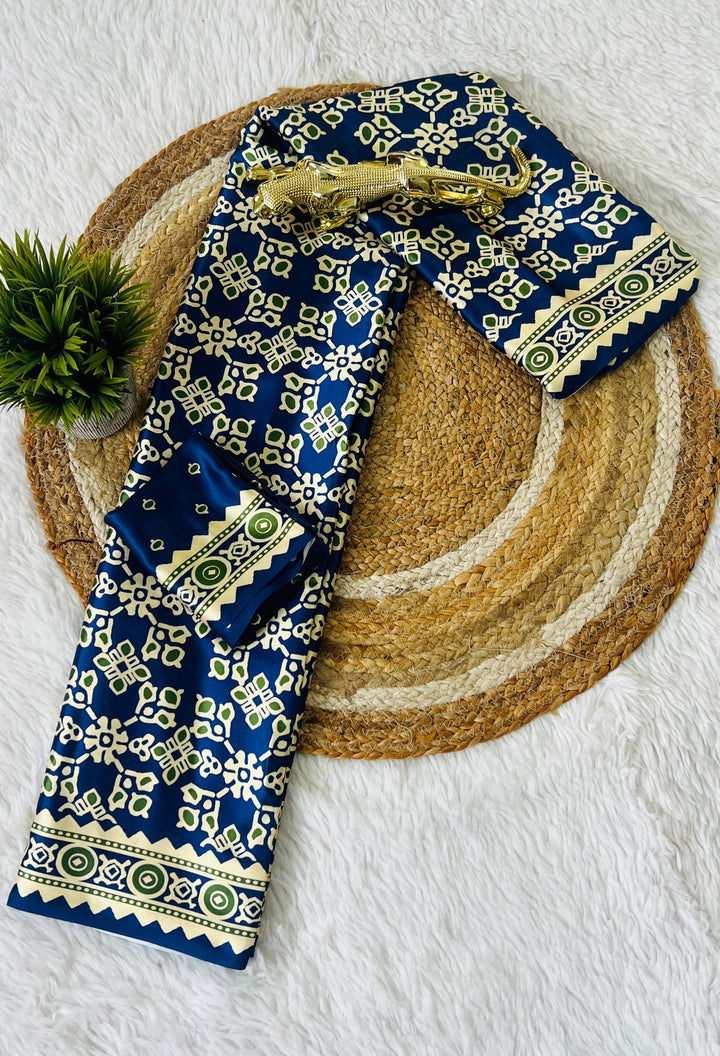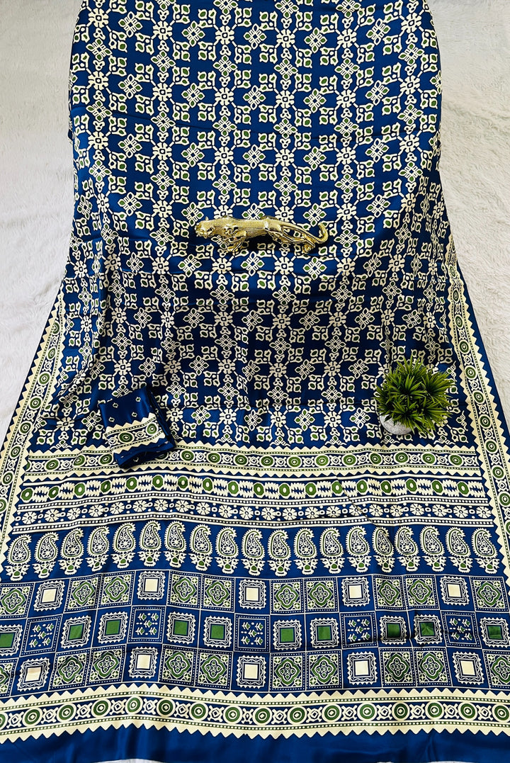 Available in semi gaji silk ajrakh natural digital print saree with ajrakh and fancy ajrakh pallu saree Same fabric Ajrakh blouse.