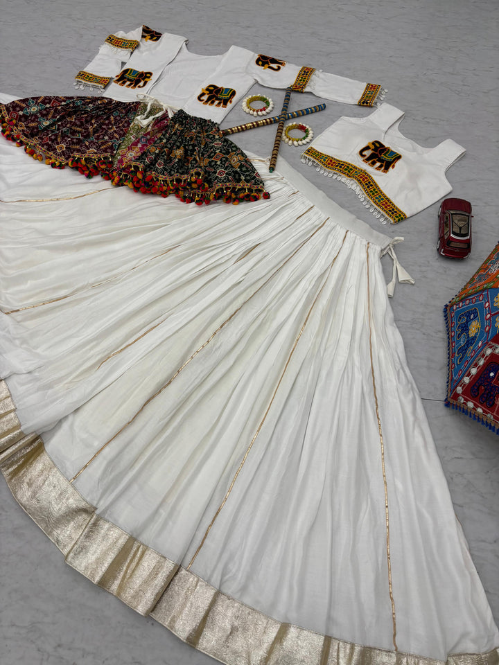 White Cotton Gamthi Work Navratri Lehenga with Koti and Kodi Lace Full Flare for Garba Nights