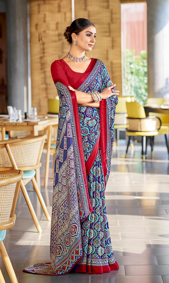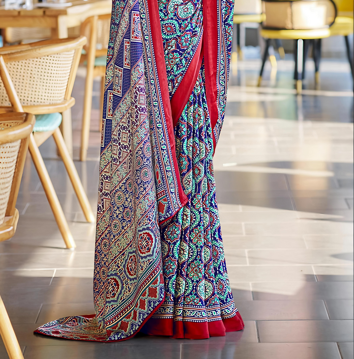 Vivid Blue Ajrakh Printed Soft Modal Silk Natural Print Saree