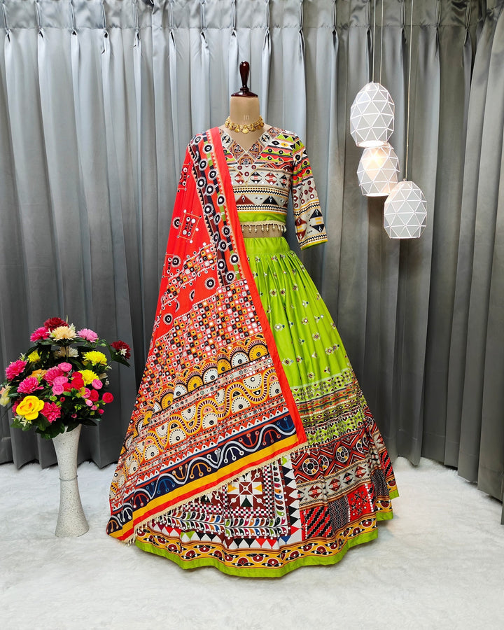Green Color Soft Butter Silk Chaniya Choli | Fancy Digital with Real Mirror Work for Traditional Wear