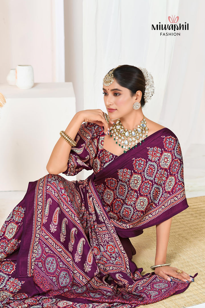 Wine Ajrakh Printed Modal Silk Plain Saree With Ajrakh Blouse P6